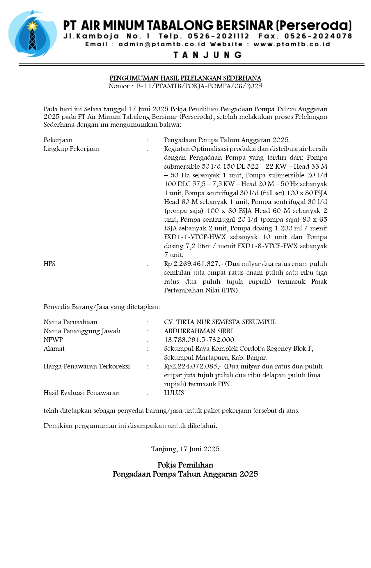 PENGUMUMAN HASIL PELELANGAN SEDERHANA PENGADAAN POMPA 2025